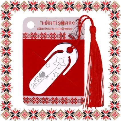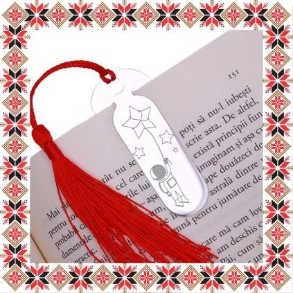 Semn de carte martisor in forma ovala realizat din inox de culoare argintie, gravat cu drag cu astronaut tinandu-se de o steluta si stele contur. Daruieste povesti de martisor! Semnul de carte cu ciucuras rosu se prinde de 2-3 pagini si pe langa faptul ca-ti aminteste pagina la care ai ramas, poarta cu el un mesaj gravat cu bucurie special pentru tine.