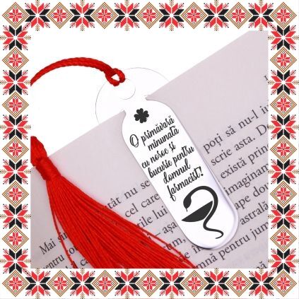 Martisor tip semn de carte in forma ovala realizat din inox de culoare argintie, gravat cu drag cu trifoi cu patru foi si mesajul O primavara minunata cu noroc si bucurie pentru domnul farmacist! Zambeste si bucura-te de fiecare raza de soare! Daruieste povesti de martisor! Semnul de carte cu ciucuras rosu se prinde de 2-3 pagini si pe langa faptul ca-ti aminteste pagina la care ai ramas, poarta cu el un mesaj gravat cu bucurie special pentru tine.
