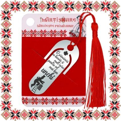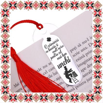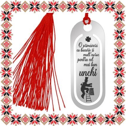 Martisor tip semn de carte in forma ovala realizat din inox de culoare argintie, gravat cu drag cu trifoi cu patru foi, cosar si mesajul O primavara cu bucurie si mult noroc pentru cel mai bun unchi! Daruieste povesti de martisor! Semnul de carte cu ciucuras rosu se prinde de 2-3 pagini si pe langa faptul ca-ti aminteste pagina la care ai ramas, poarta cu el un mesaj gravat cu bucurie special pentru tine.