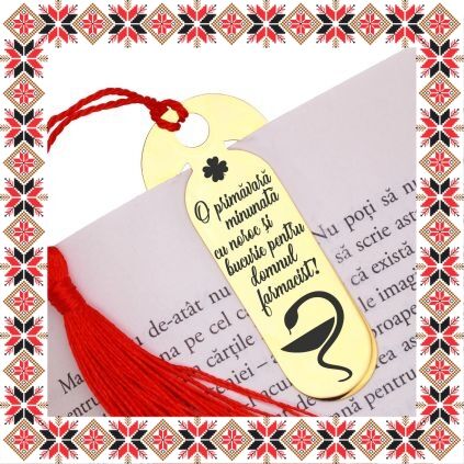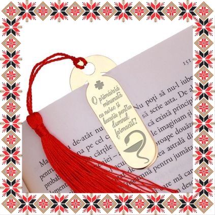 Martisor tip semn de carte in forma ovala realizat din inox de culoare aurie, gravat cu drag cu trifoi cu patru foi si mesajul O primavara minunata cu noroc si bucurie pentru domnul farmacist! Daruieste povesti de martisor! Semnul de carte cu ciucuras rosu se prinde de 2-3 pagini si pe langa faptul ca-ti aminteste pagina la care ai ramas, poarta cu el un mesaj gravat cu bucurie special pentru tine.
