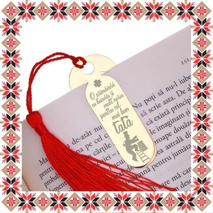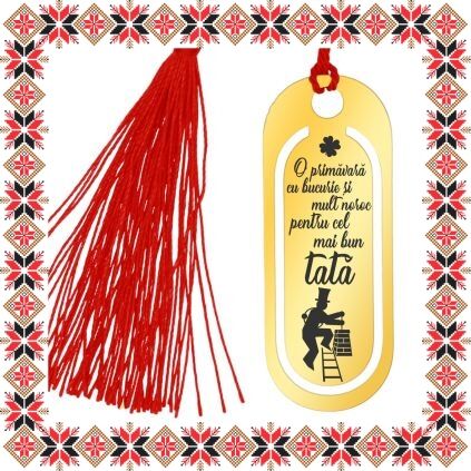 Martisor tip semn de carte in forma ovala realizat din inox de culoare aurie, gravat cu drag cu trifoi cu patru foi, cosar si mesajul O primavara cu bucurie si mult noroc pentru cel mai bun tata! Daruieste povesti de martisor! Semnul de carte cu ciucuras rosu se prinde de 2-3 pagini si pe langa faptul ca-ti aminteste pagina la care ai ramas, poarta cu el un mesaj gravat cu bucurie special pentru tine.