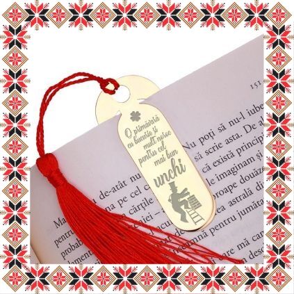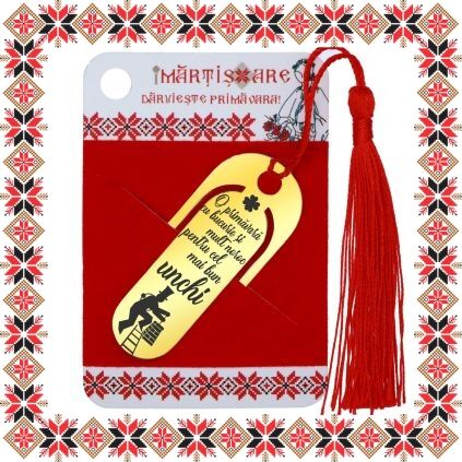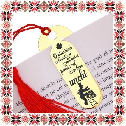 Martisor tip semn de carte in forma ovala realizat din inox de culoare aurie, gravat cu drag cu trifoi cu patru foi, cosar si mesajul O primavara cu bucurie si mult noroc pentru cel mai bun unchi! Daruieste povesti de martisor! Semnul de carte cu ciucuras rosu se prinde de 2-3 pagini si pe langa faptul ca-ti aminteste pagina la care ai ramas, poarta cu el un mesaj gravat cu bucurie special pentru tine.