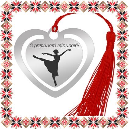 Semn de carte martisor in forma de inima din inox de culoare argintie gravata cu drag cu silueta unei balerine si urarea O primavara minunata! Daruieste povesti de martisor! Semnul de carte cu ciucuras rosu se prinde de 2-3 pagini si pe langa faptul ca-ti aminteste pagina la care ai ramas, poarta cu el un mesaj gravat cu bucurie special pentru tine.