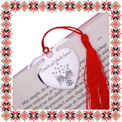 Semn de carte martisor in forma de inima din inox de culoare argintie gravata cu drag cu o carte deschisa si mesajul Cuvintele pot schimba lumea! Daruieste povesti de martisor!Semnul de carte cu ciucuras rosu se prinde de 2-3 pagini si pe langa faptul ca-ti aminteste pagina la care ai ramas, poarta cu el un mesaj gravat cu bucurie special pentru tine.