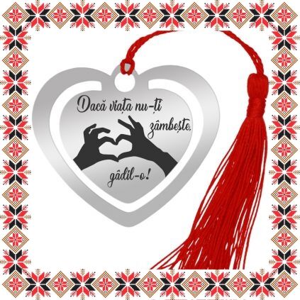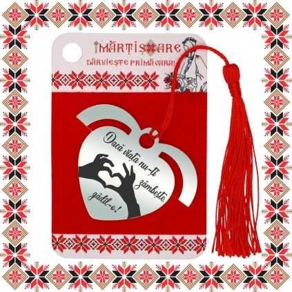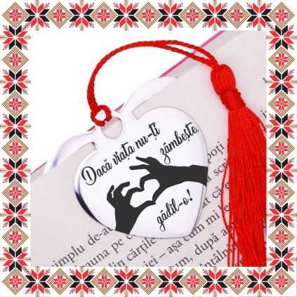 Semn de carte martisor in forma de inima din inox de culoare argintie gravata cu drag cu doua maini care formeaza o inima si mesajul Daca viata nu-ti zambeste, gadil-o! Daruieste povesti de martisor! Semnul de carte cu ciucuras rosu se prinde de 2-3 pagini si pe langa faptul ca-ti aminteste pagina la care ai ramas, poarta cu el un mesaj gravat cu bucurie special pentru tine.