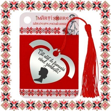 Semn de carte martisor in forma de inima din inox de culoare argintie gravata cu drag cu silueta unei doamne si mesajul Esti atat de frumoasa cand zambesti! Daruieste liniste si povesti de martisor! Semnul de carte cu ciucuras rosu se prinde de 2-3 pagini si pe langa faptul ca-ti aminteste pagina la care ai ramas, poarta cu el un mesaj gravat cu bucurie special pentru tine.