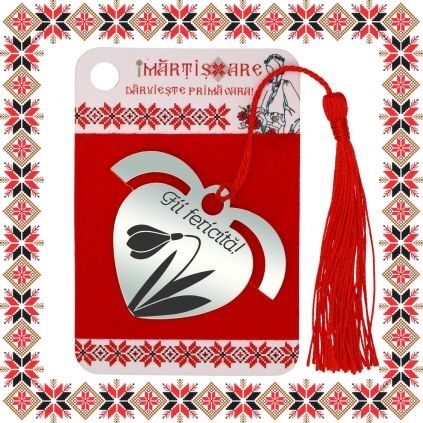 Semn de carte martisor in forma de inima din inox de culoare argintie gravata cu drag cu un ghiocel si mesajul Fii fericita! Daruieste povesti de martisor! Semnul de carte cu ciucuras rosu se prinde de 2-3 pagini si pe langa faptul ca-ti aminteste pagina la care ai ramas, poarta cu el un mesaj gravat cu bucurie special pentru tine.