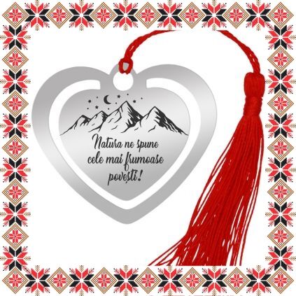 Semn de carte martisor in forma de inima din inox de culoare argintie gravata cu drag cu munti stele si semiluna si mesajul Natura ne spune cele mai frumoase povesti! Daruieste povesti de martisor! Semnul de carte cu ciucuras rosu se prinde de 2-3 pagini si pe langa faptul ca-ti aminteste pagina la care ai ramas, poarta cu el un mesaj gravat cu bucurie special pentru tine.