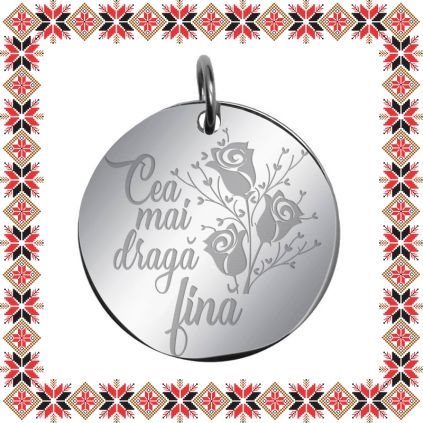 Pandantiv martisor in forma de banut norocos din inox de culoare argintie gravat cu flori de trandafir pentru "Cea mai draga fina". Daruieste martisoare personalizate! Alege un martisor realizat din otel inoxidabil pentru ca primitoarea il va putea purta tot anul. Alege modelul care i se potriveste si fa-o sa zambeasca odata cu venirea primaverii!