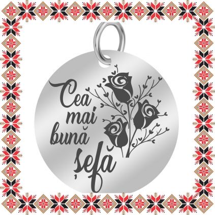 Pandantiv martisor in forma de banut norocos din inox de culoare argintie gravat cu flori de trandafir pentru "Cea mai buna sefa". Daruieste martisoare personalizate! Alege un martisor realizat din otel inoxidabil pentru ca primitoarea il va putea purta tot anul, fa-o sa zambeasca odata cu venirea primaverii!