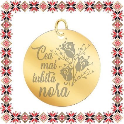 Pandantiv martisor in forma de banut norocos din inox de culoare aurie gravat cu flori de trandafir pentru "Cea mai iubita nora". Daruieste martisoare personalizate! Alege un martisor realizat din otel inoxidabil pentru ca primitoarea il va putea purta tot anul. Alege modelul care i se potriveste si fa-o sa zambeasca odata cu venirea primaverii!