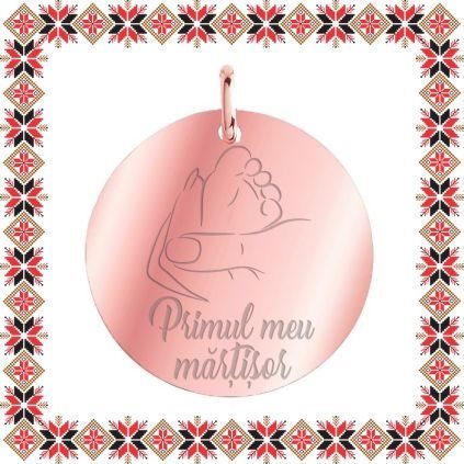 Pandantiv martisor in forma de banut norocos din inox de culoare rose gold gravat cu piciorusul unui bebelus in mana mamei si mesajul Primul meu martisor. Daruieste amintiri de martisor! Alege un martisor realizat din otel inoxidabil pentru ca primitoarea il va putea purta tot anul, fa-o sa zambeasca odata cu venirea primaverii!
