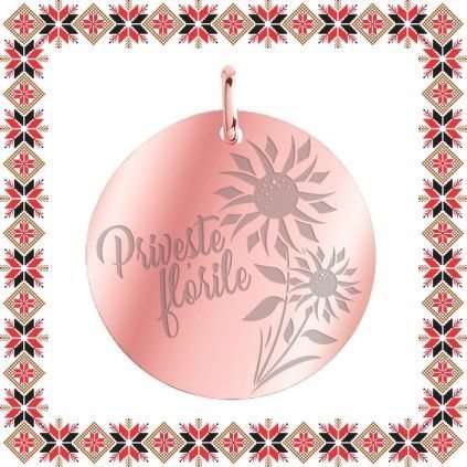 Pandantiv martisor in forma de banut norocos din inox de culoare rose gold gravat cu flori si mesajul Priveste florile. Daruieste flori de martisor! Alege un martisor realizat din otel inoxidabil pentru ca primitoarea il va putea purta tot anul. Alege modelul care i se potriveste si fa-o sa zambeasca odata cu venirea primaverii!