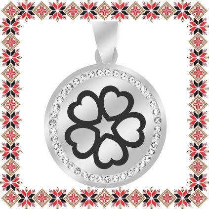 Pandantiv martisor in forma de banut norocos din inox de culoare argintie cu pietricele multifatetate transparente. Pandantiv gravat cu o floare formata din inimioare. Daruieste sentimente de martisor! Alege un martisor realizat din otel inoxidabil pentru ca primitoarea il va putea purta tot anul. Alege modelul care i se potriveste si fa-o sa zambeasca odata cu venirea primaverii!