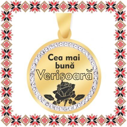 Pandantiv martisor in forma de banut norocos din inox de culoare aurie cu pietricele multifatetate transparente. Pandantiv gravat cu floare de trandafir si mesajul Cea mai buna verisoara. Daruieste martisoare personalizate! Alege un martisor realizat din otel inoxidabil pentru ca primitoarea il va putea purta tot anul, fa-o sa zambeasca odata cu venirea primaverii!