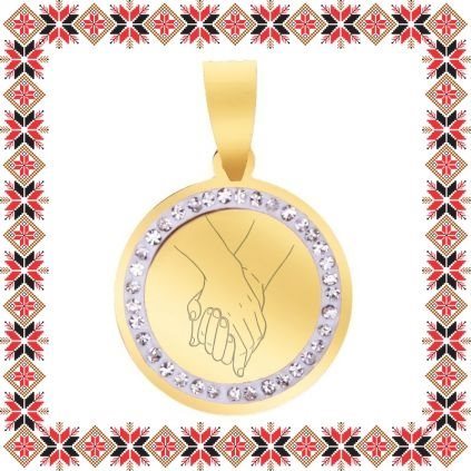 Pandantiv martisor in forma de banut norocos din inox de culoare aurie cu pietricele multifatetate transparente. Pandantiv gravat cu doua maini impreunate. Daruieste emotie de martisor! Alege un martisor realizat din otel inoxidabil pentru ca primitoarea il va putea purta tot anul, fa-o sa zambeasca odata cu venirea primaverii!