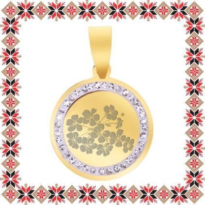 Pandantiv martisor in forma de banut norocos din inox de culoare aurie cu pietricele multifatetate transparente. Pandantiv gravat cu o flori de cires! Alege un martisor realizat din otel inoxidabil pentru ca primitoarea il va putea purta tot anul. Alege modelul care i se potriveste si fa-o sa zambeasca odata cu venirea primaverii!