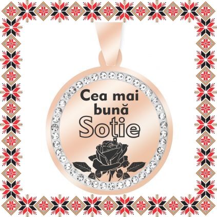 Pandantiv martisor in forma de banut norocos din inox de culoare rose gold cu pietricele multifatetate transparente. Pandantiv gravat cu floare de trandafir si mesajul Cea mai buna sotie. Daruieste martisoare personalizate! Alege un martisor realizat din otel inoxidabil pentru ca primitoarea il va putea purta tot anul, fa-o sa zambeasca odata cu venirea primaverii!