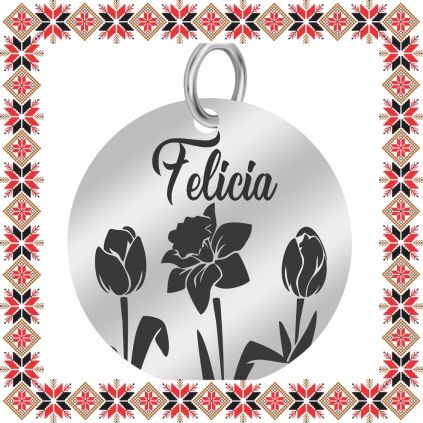 Pandantiv martisor in forma de banut norocos din inox de culoare argintie gravat cu flori, lalale si narcisa si numele doamnei dragi din viata ta, Felicia! Daruieste martisoare personalizate!Alege un martisor realizat din otel inoxidabil pentru ca primitoarea il va putea purta tot anul, fa-o sa zambeasca odata cu venirea primaverii!