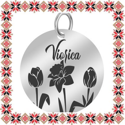 Pandantiv martisor in forma de banut norocos din inox de culoare argintie gravat cu flori, lalale si narcisa si numele doamnei dragi din viata ta, Viorica! Daruieste martisoare personalizate! Alege un martisor realizat din otel inoxidabil pentru ca primitoarea il va putea purta tot anul. Alege modelul care i se potriveste si fa-o sa zambeasca odata cu venirea primaverii!