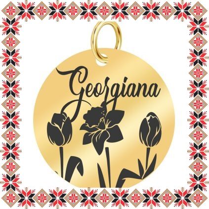 Pandantiv martisor in forma de banut norocos din inox de culoare aurie gravat cu flori, lalale si narcisa si numele doamnei dragi din viata ta, Georgiana! Daruieste martisoare personalizate! Alege un martisor realizat din otel inoxidabil pentru ca primitoarea il va putea purta tot anul. Alege modelul care i se potriveste si fa-o sa zambeasca odata cu venirea primaverii!