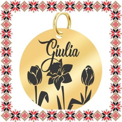 Pandantiv martisor in forma de banut norocos din inox de culoare aurie gravat cu flori, lalale si narcisa si numele doamnei dragi din viata ta, Giulia! Daruieste martisoare personalizate! Alege un martisor realizat din otel inoxidabil pentru ca primitoarea il va putea purta tot anul. Alege modelul care i se potriveste si fa-o sa zambeasca odata cu venirea primaverii!