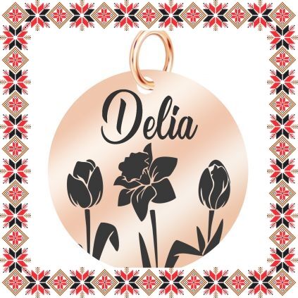 Pandantiv martisor in forma de banut norocos din inox de culoare rose gold gravat cu flori, lalale si narcisa si numele doamnei dragi din viata ta, Delia! Daruieste martisoare personalizate! Alege un martisor realizat din otel inoxidabil pentru ca primitoarea il va putea purta tot anul. Alege modelul care i se potriveste si fa-o sa zambeasca odata cu venirea primaverii!