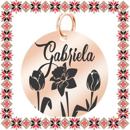 Pandantiv martisor in forma de banut norocos din inox de culoare rose gold gravat cu flori, lalale si narcisa si numele doamnei dragi din viata ta, Gabriela! Daruieste martisoare personalizate! Alege un martisor realizat din otel inoxidabil pentru ca primitoarea il va putea purta tot anul. Alege modelul care i se potriveste si fa-o sa zambeasca odata cu venirea primaverii!