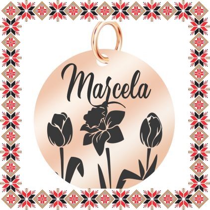 Pandantiv martisor in forma de banut norocos din inox de culoare rose gold gravat cu flori, lalale si narcisa si numele doamnei dragi din viata ta, Marcela! Daruieste martisoare personalizate! Alege un martisor realizat din otel inoxidabil pentru ca primitoarea il va putea purta tot anul. Alege modelul care i se potriveste si fa-o sa zambeasca odata cu venirea primaverii!