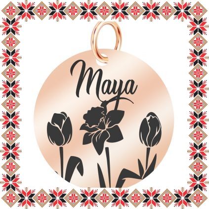 Pandantiv martisor in forma de banut norocos din inox de culoare rose gold gravat cu flori, lalale si narcisa si numele doamnei dragi din viata ta, Maya! Daruieste martisoare personalizate! Alege un martisor realizat din otel inoxidabil pentru ca primitoarea il va putea purta tot anul. Alege modelul care i se potriveste si fa-o sa zambeasca odata cu venirea primaverii!