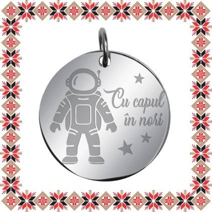 Pandantiv martisor in forma de banut norocos din inox de culoare argintie gravat cu astronaut, stele si mesajul Cu capul in nori! Martisor creat pentru iubitoarele de stele! Un martisor personalizat, incarcat de semnificatie, creat special pentru ea!Alege un martisor realizat din otel inoxidabil pentru ca nu isi schimba culoarea, este rezistent in timp si poate fi purtat tot anul ca accesoriu la colier, potrivit oricarei tinute. Ofera primavara in dar cu un martisor special!