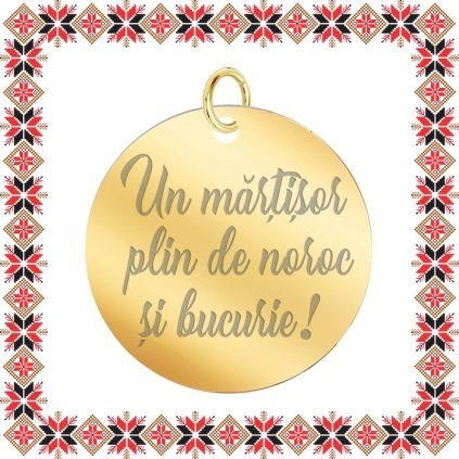 Pandantiv martisor in forma de banut norocos din inox de culoare aurie gravat cu mesajul Un martisor plin de noroc si bucurie! Martisor personalizat creat cu entuziasm si bucurie! Un martisor personalizat, incarcat de semnificatie, creat special pentru ea!Alege un martisor realizat din otel inoxidabil pentru ca nu isi schimba culoarea, este rezistent in timp si poate fi purtat tot anul ca accesoriu la colier, potrivit oricarei tinute. Ofera primavara in dar cu un martisor special!