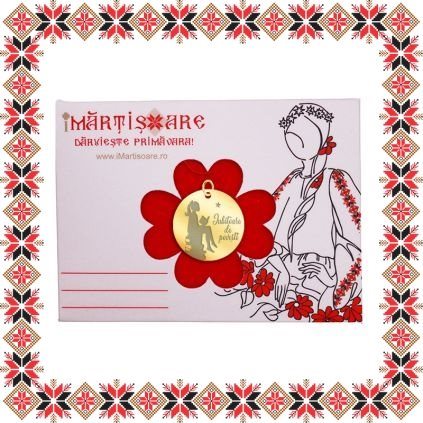 Martisor ambalat pe suport de carton cu catifea rosie si plic scrisoare de la doamna Primavara, de culoare bej cu motive traditionale romanesti. Martisorul este insotit de plic de hartie imprimat cu motive traditionale romanesti si snur de martisor. Deasemenea veti primi alaturi de martisor bucuria cu care noi l-am creat, tot ce trebuie sa faceti este sa adaugati bucuria daruirii si sa il oferiti persoanei dragi impreuna cu primavara.