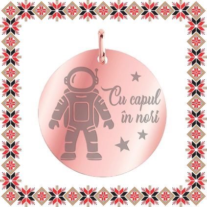 Pandantiv martisor in forma de banut norocos din inox de culoare rose gold gravat cu astronaut, stele si mesajul Cu capul in nori! Martisor creat pentru iubitoarele de stele! Un martisor personalizat, incarcat de semnificatie, creat special pentru ea!Alege un martisor realizat din otel inoxidabil pentru ca nu isi schimba culoarea, este rezistent in timp si poate fi purtat tot anul ca accesoriu la colier, potrivit oricarei tinute. Ofera primavara in dar cu un martisor special!