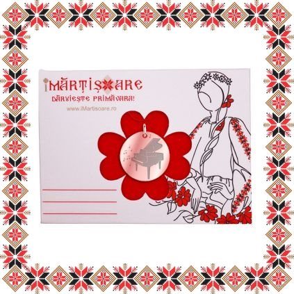 Martisor ambalat pe suport de carton cu catifea rosie si plic scrisoare de la doamna Primavara, de culoare bej cu motive traditionale romanesti. Martisorul este insotit de plic de hartie imprimat cu motive traditionale romanesti si snur de martisor. Deasemenea veti primi alaturi de martisor, bucuria cu care noi l-am creat, tot ce trebuie sa faceti este sa adaugati bucuria daruirii si sa il oferiti persoanei dragi impreuna cu primavara.