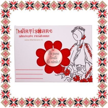 Martisor ambalat pe suport de carton cu catifea rosie si plic scrisoare de la doamna Primavara, de culoare bej cu motive traditionale romanesti. Martisorul este insotit de plic de hartie imprimat cu motive traditionale romanesti si snur de martisor. Deasemenea veti primi alaturi de martisor, bucuria cu care noi l-am creat, tot ce trebuie sa faceti este sa adaugati bucuria daruirii si sa il oferiti persoanei dragi impreuna cu primavara.