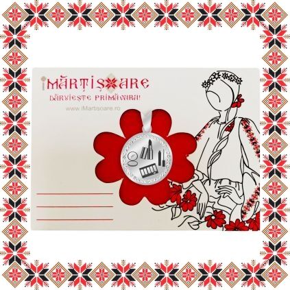 Martisor ambalat pe suport de carton cu catifea rosie si plic scrisoare de la doamna Primavara, de culoare bej cu motive traditionale romanesti. Martisorul este insotit de plic de hartie imprimat cu motive traditionale romanesti si snur de martisor. Deasemenea veti primi alaturi de martisor bucuria cu care noi l-am creat, tot ce trebuie sa faceti este sa adaugati bucuria daruirii si sa il oferiti persoanei dragi impreuna cu primavara.