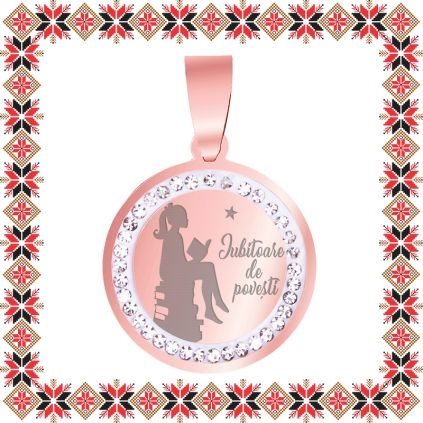 Pandantiv martisor in forma de banut norocos din inox de culoare rose gold cu pietricele multifatetate transparente. Pandantiv gravat cu o silueta a unei domnisoare citind pe un teanc de carti si mesajul Iubitoare de povesti.Un martisor personalizat, incarcat de semnificatie, creat special pentru ea!Alege un martisor realizat din otel inoxidabil pentru ca nu isi schimba culoarea, este rezistent in timp si poate fi purtat tot anul ca accesoriu la colier, potrivit oricarei tinute. Ofera primavara in dar cu un martisor special!
