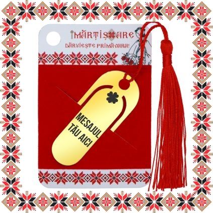 Martisor ambalat pe suport de carton de culoare bej cu desene motive traditionale romanesti si catifea rosie. Ambalajul este inscriptionat cu urarea Daruieste Primavara!