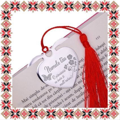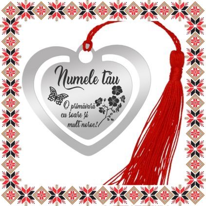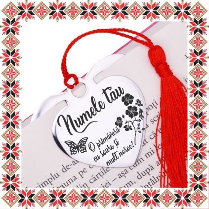 Semn de carte martisor personalizat in forma de inima din inox de culoare argintie gravata cu drag cu numele tau, fluture, flori de cires si mesajul O primavara cu soare si mult noroc! Un martisor special pentru persoane dragi! Semnul de carte cu ciucuras rosu se prinde de 2-3 pagini si pe langa faptul ca-ti aminteste pagina la care ai ramas, poarta cu el un mesaj gravat cu bucurie special pentru tine.