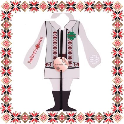 Martisor ambalat pe suport de carton de culoare bej in forma de costum popular romanesc cu motive traditionale. Plic de hartie imprimat cu motive traditionale romanesti CADOU!