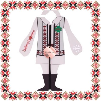 Martisor ambalat pe suport de carton de culoare bej in forma de costum popular romanesc cu motive traditionale. Plic de hartie imprimat cu motive traditionale romanesti CADOU!