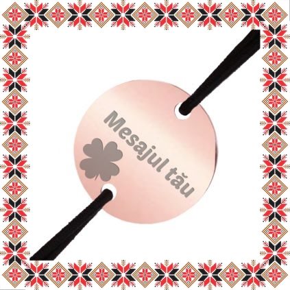 Bratara martisor cu pandantiv in forma de banut norocos de culoare rose gold gravat cu trifoi cu patru foi si personalizare cu mesajul tau. Alege un martisor realizat din otel inoxidabil pentru ca nu isi schimba culoarea, este rezistent in timp si poate fi purtat tot anul ca accesoriu bratara potrivit oricarei tinute. Ofera primavara in dar cu un martisor special! Gravam cu bucurie!