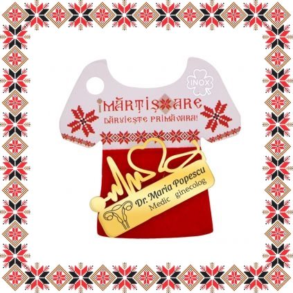 Martisor ambalat pe suport de carton in forma de ie romaneasca cu catifea rosie si motive traditionale romanesti. Martisorul este insotit de plic de hartie imprimat cu motive traditionale romanesti si snur de martisor. Deasemenea veti primi alaturi de martisor bucuria cu care noi l-am creat, tot ce trebuie sa faceti este sa adaugati bucuria daruirii si sa il oferiti persoanei dragi impreuna cu primavara!