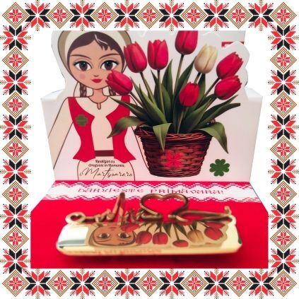 Martisor ambalat premium pe suport de carton tip felicitare 3D de culoare bej cu catifea rosie, tematica inspirata din folclor si stil prietenos, design traditional, stil modern.
