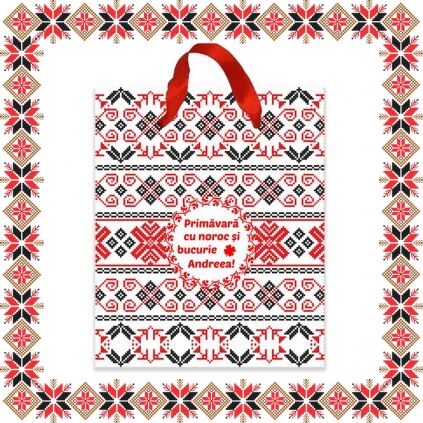 Punguta cadou cu dimensiune 12x14.5x6cm, imprimata cu motive traditionale si mesajul Primavara cu noroc si bucurie si numele persoanei careia urmeaza sa ii daruiesti martisorul! Daruieste cadoul tau complet de martisor!