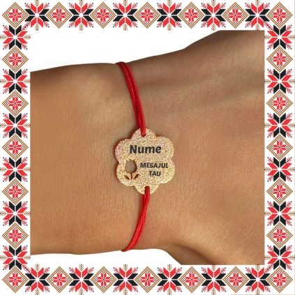 Bratara martisor cu pandantiv realizat din inox auriu in forma de floare cu perforatie lalea gravat cu cu numele sau mesajul pe care le introduci la Personalizare. Pandantiv praf de stele cu efect stralucitor pe o parte si efect oglinda pe cealalta parte. Dimensiunea bratarii se poate regla prin cele doua noduri culisante, fiind potrivita pentru diferite circumferinte ale mainii. Gravam cu bucurie martisoare cu personalitate, special create pentru oamenii dragi din viata ta!