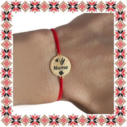 Bratara martisor cu pandantiv realizat din inox auriu in forma de banut norocos, cu efect praf de stele stralucitor pe o parte si oglinda pe verso gravata cu ghiocel, trifoi si nume. Dimensiunea bratarii se poate regla prin cele doua noduri culisante, fiind potrivita pentru diferite circumferinte ale mainii. Gravam cu bucurie martisoare cu personalitate, special create pentru oamenii dragi din viata ta!