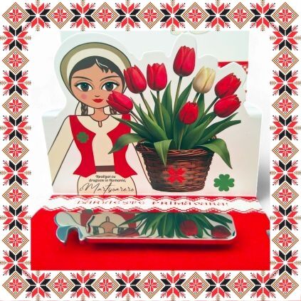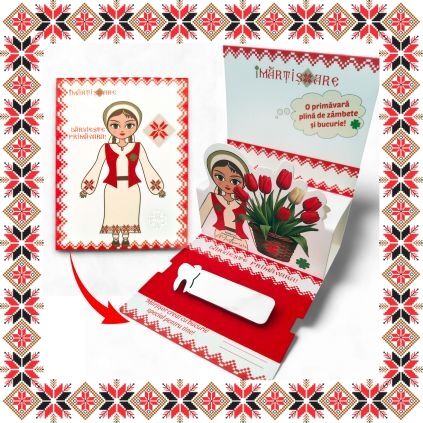 Martisor ambalat premium pe suport de carton tip felicitare 3D de culoare bej cu catifea rosie, tematica inspirata din folclor si stil prietenos, design traditional, stil modern.