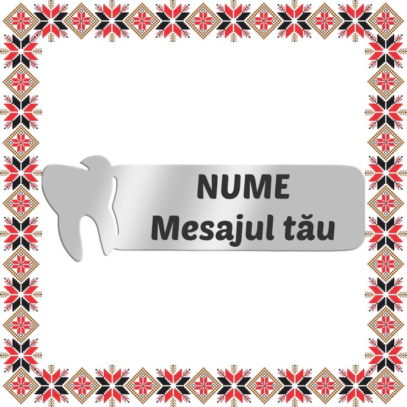 Martisor personalizat brosa tip ecuson argintiu cu dintisor si placuta din inox, realizat pentru cei care profeseaza in domeniul stomatologiei. Personalizat prin gravura laser cu numele si mesajul pe care ti-l doresti! Daruieste martisoare deosebite, personalizate special pentru oamenii pe care ii iubesti, pe care ii admiri, celor carora vrei sa le multumesti si celor care isi practica meseria cu pasiune si entuziasm! Opteaza pentru un martisor realizat din otel inoxidabil pentru ca primitoarea sa il poata purta tot anul.